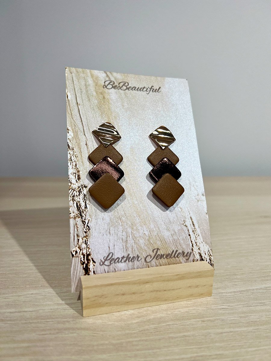 • Egyedi készítésű, barna-arany színű, kocka bőr fülbevaló.