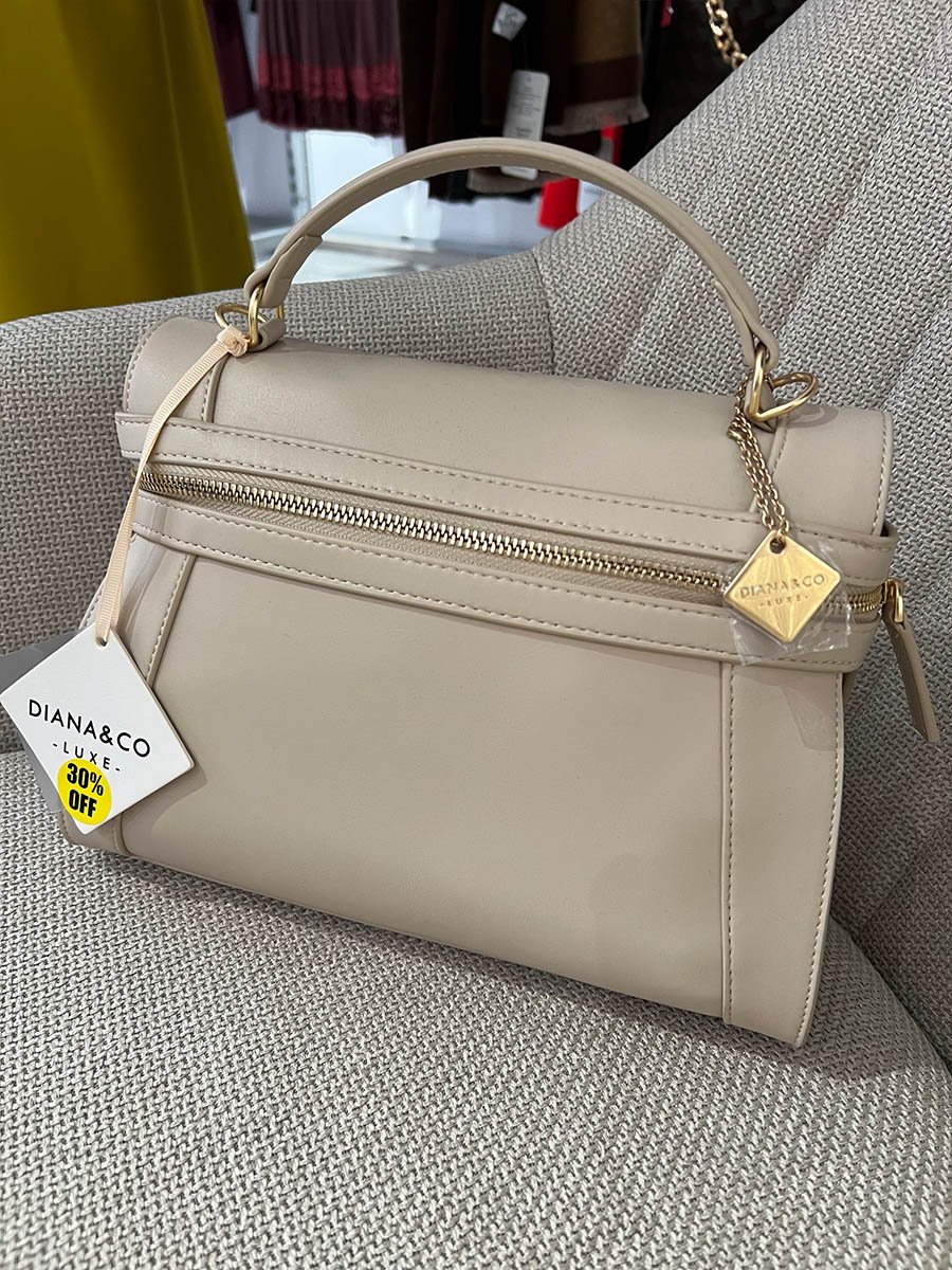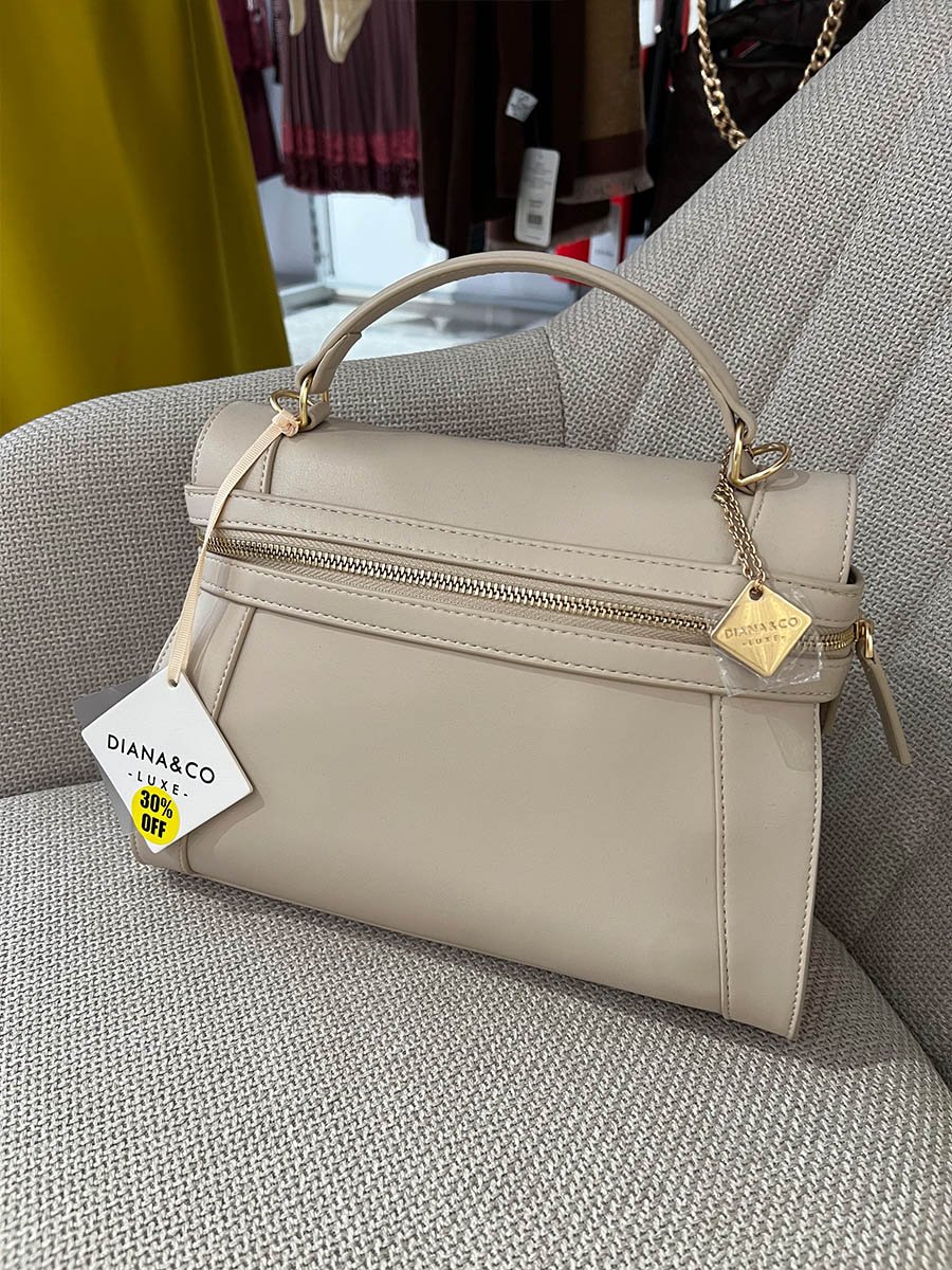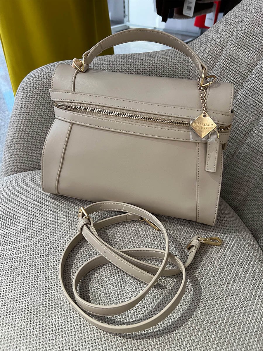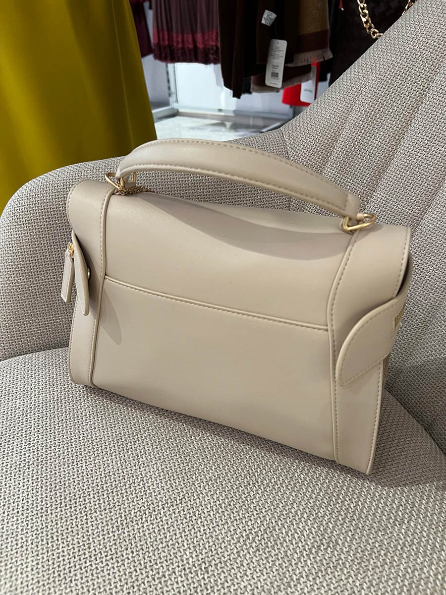• Bézs színű, műbőrből készült táska.