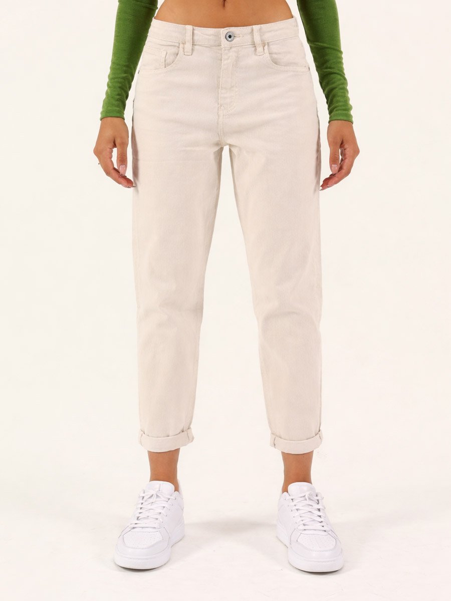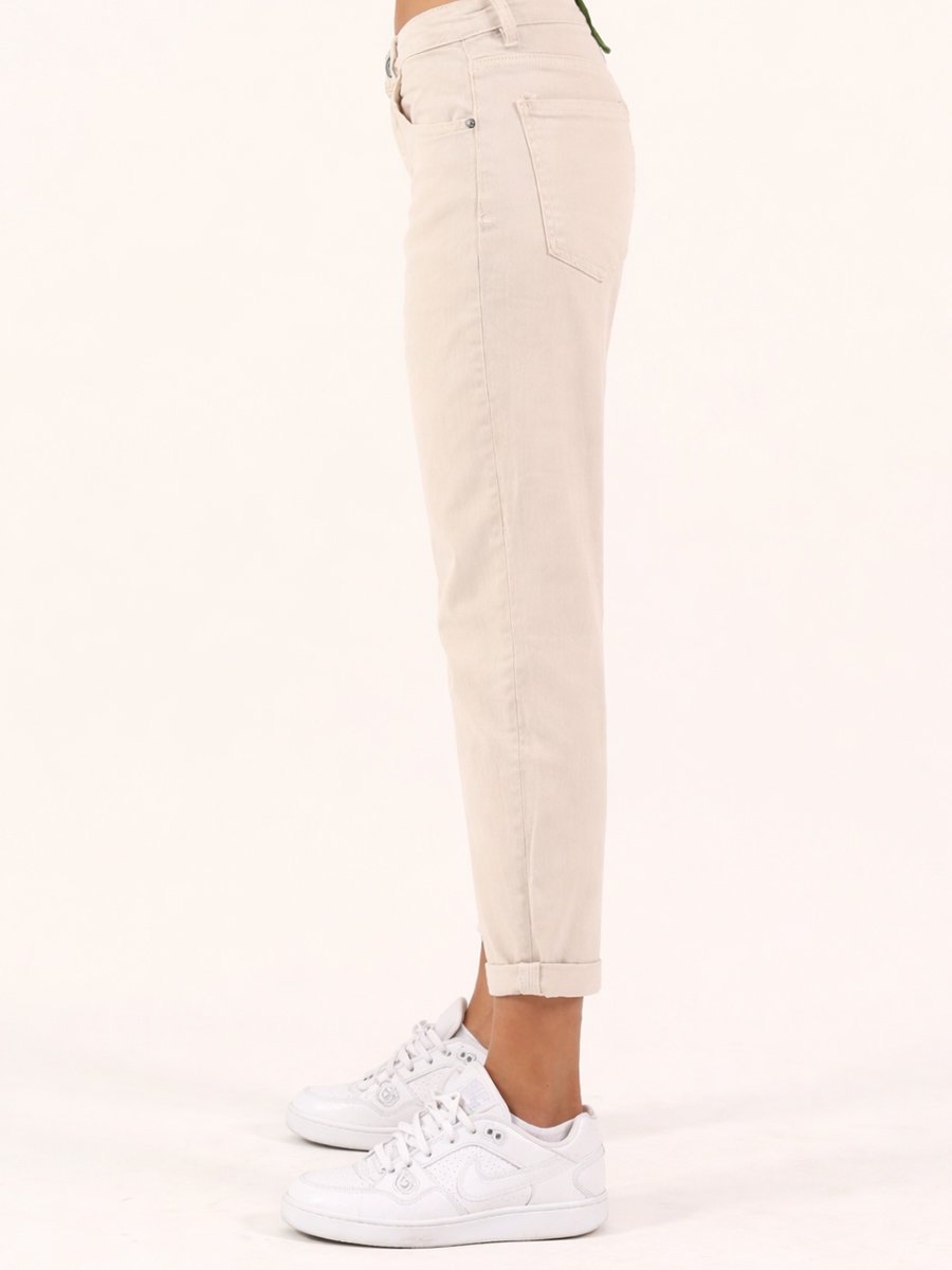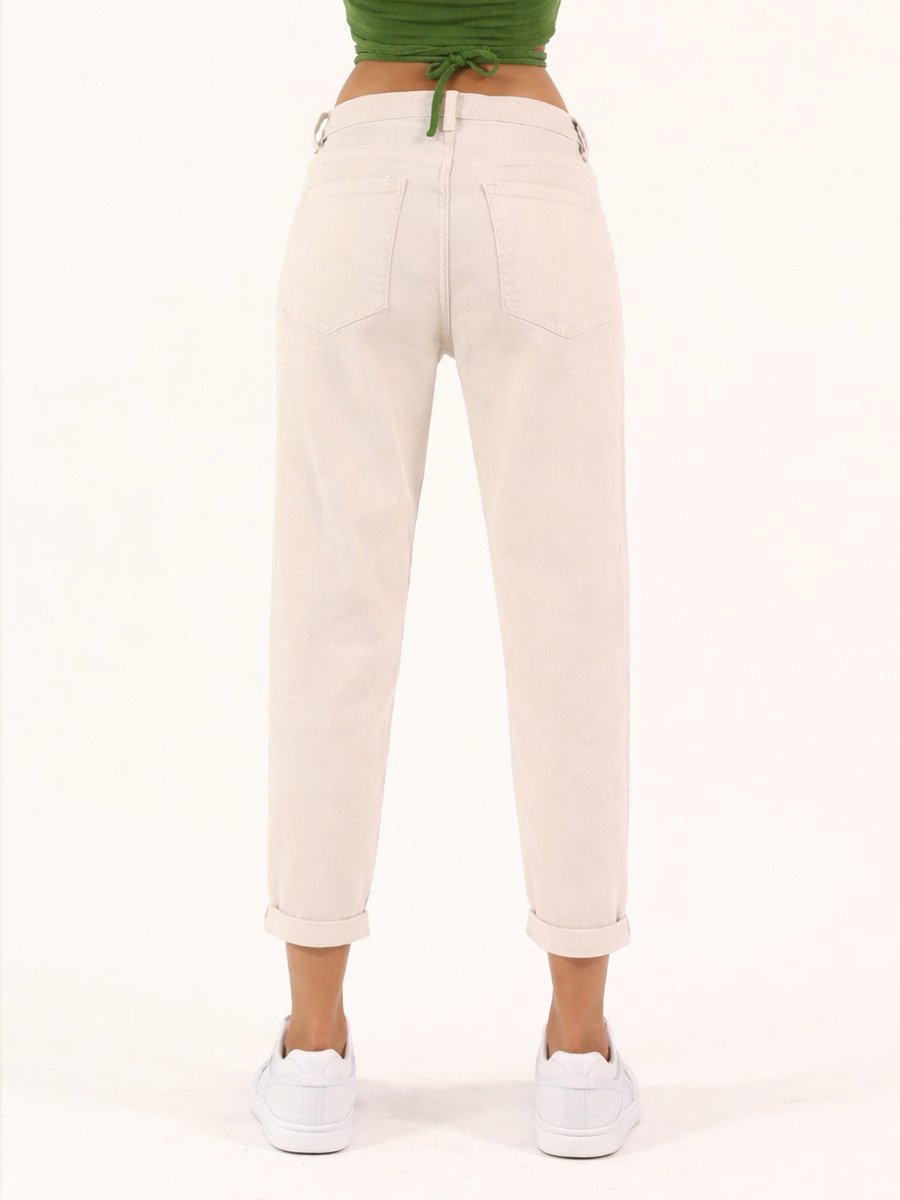 - Bézs színű, mom fit fazonú farmer.