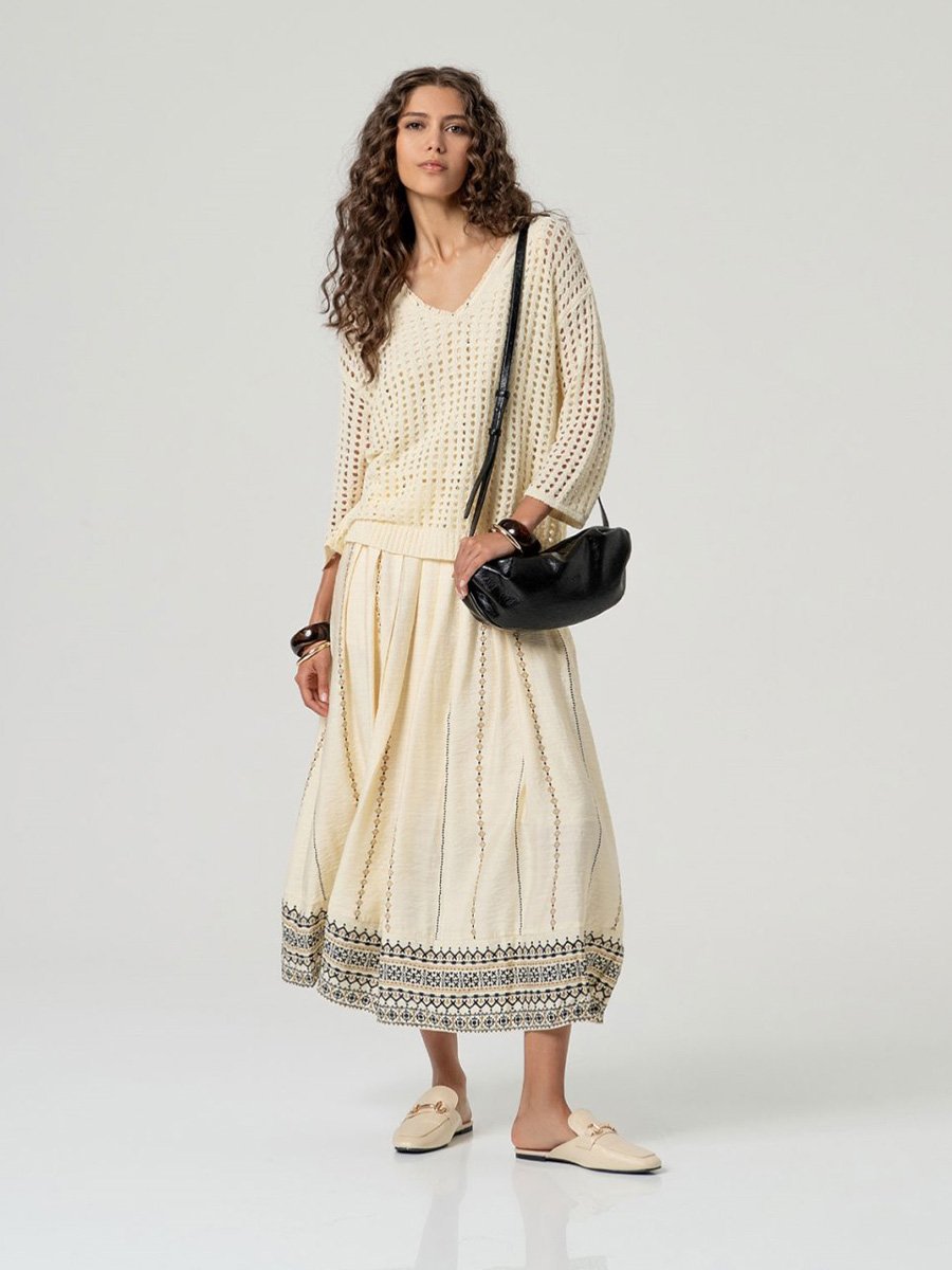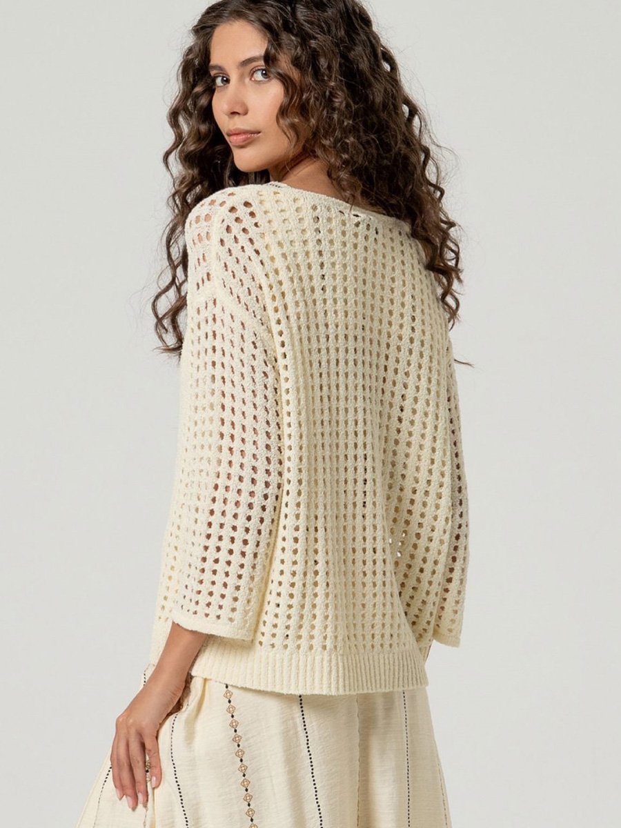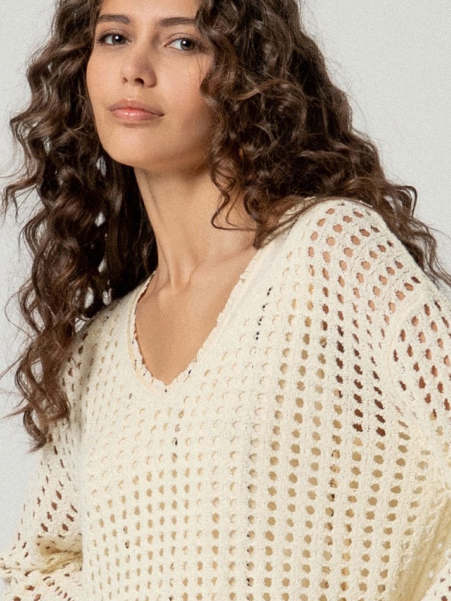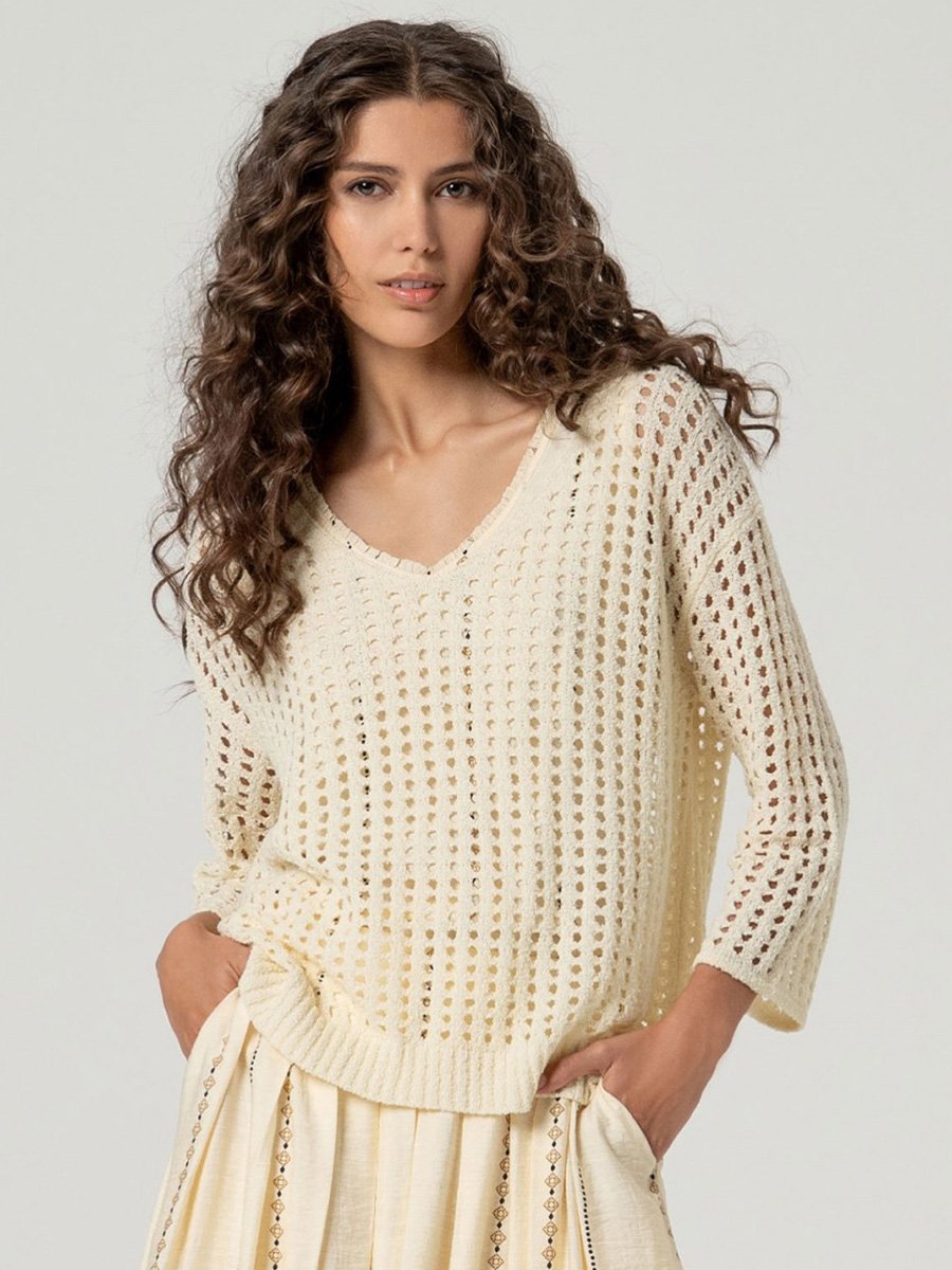 - Bézs színű, V-nyakú, kötött lyukacsos pulóver