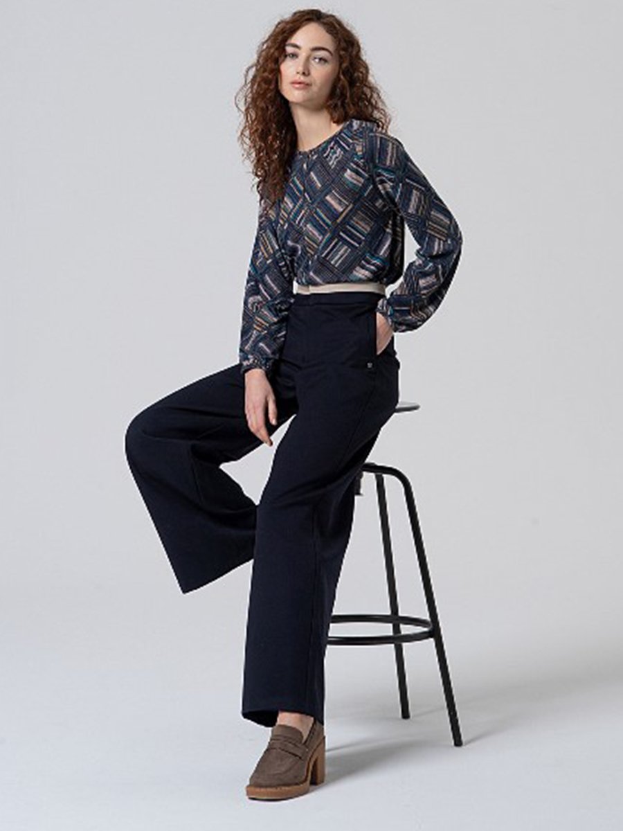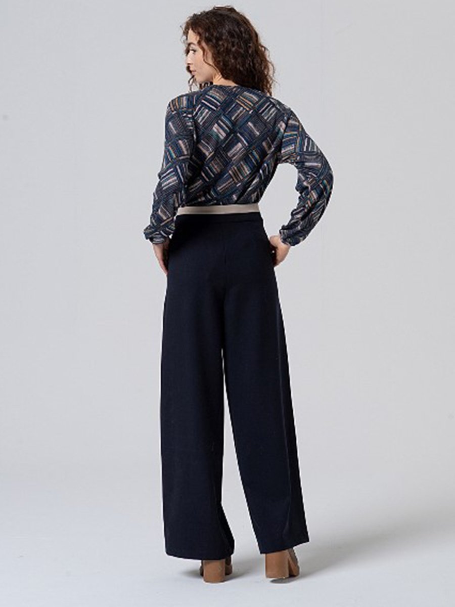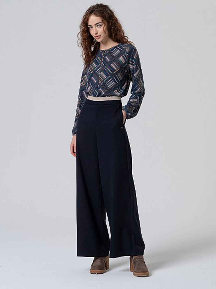 - Bő szárú nadrág, kontrasztos derékpánt díszíti, kényelmes őszi viselet.