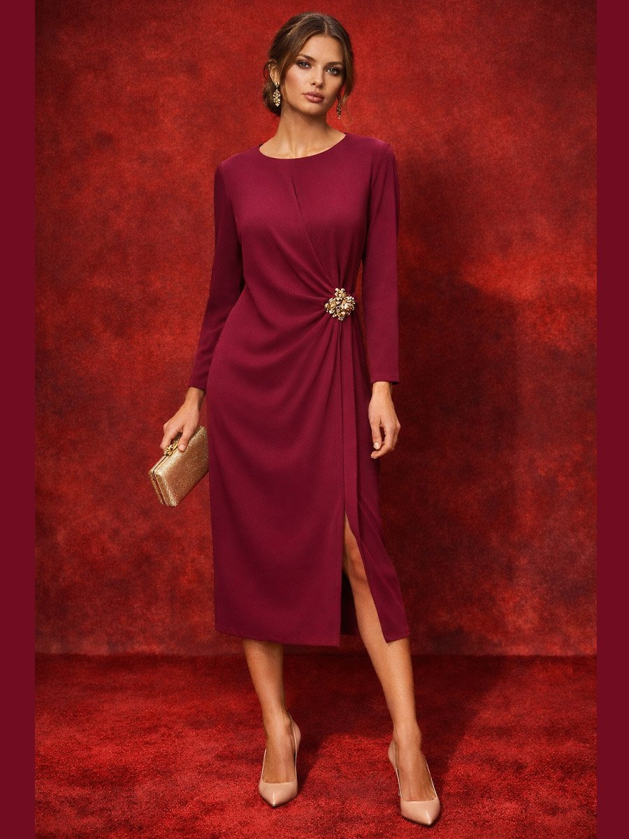 - Burgundi elegáns aszimmetrikus ruha, díszcsattal