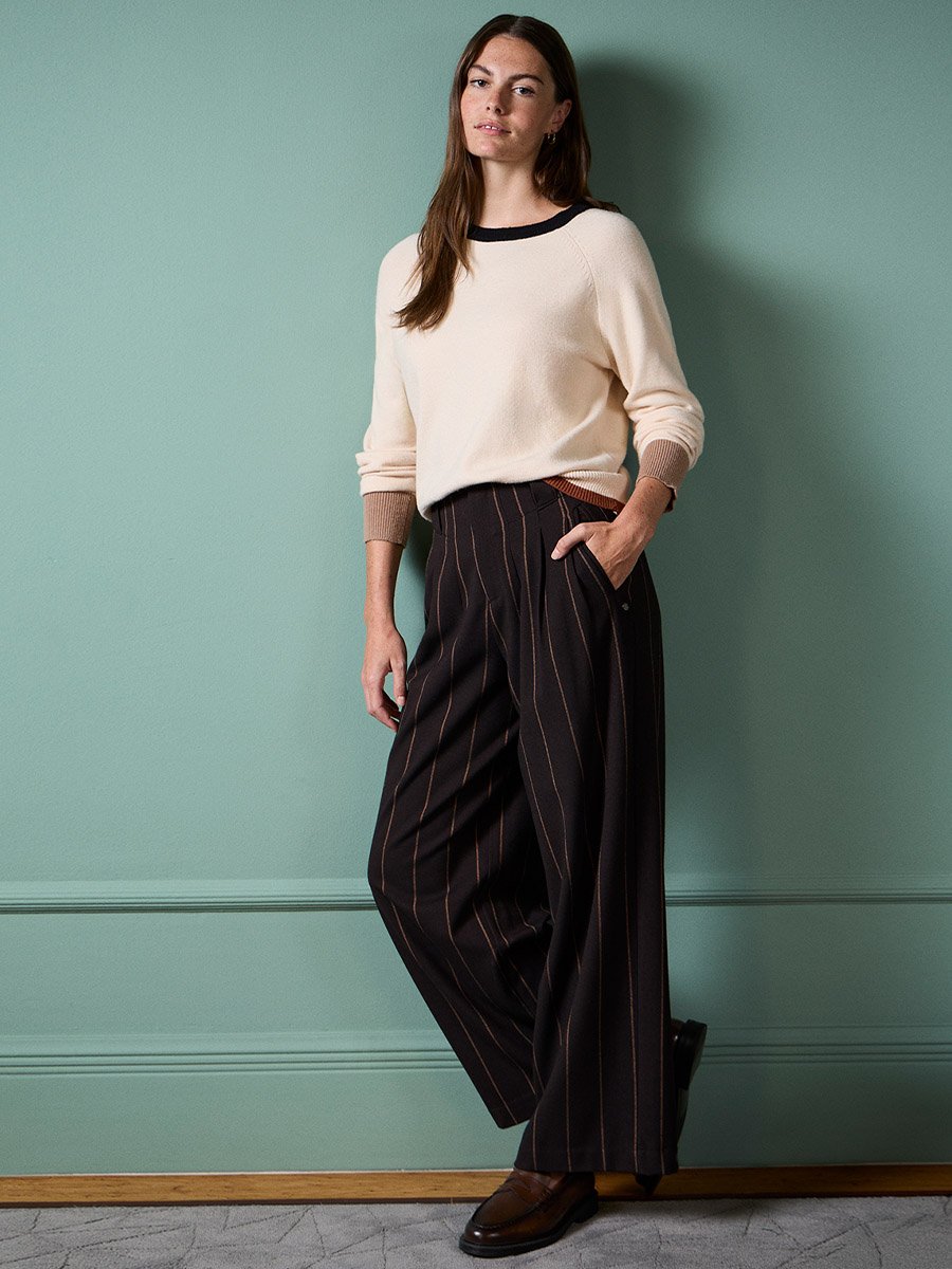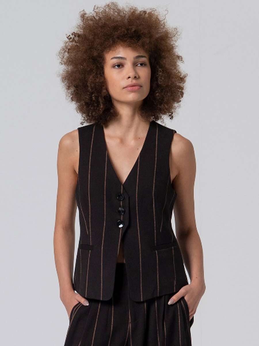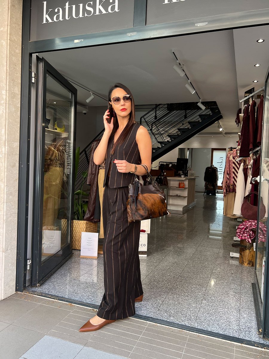 - Csíkos, csoki barna palazzo fazonú nadrág, tökéletes választás lehet az őszi napokra, akár a hozzápasszoló mellénnyel.