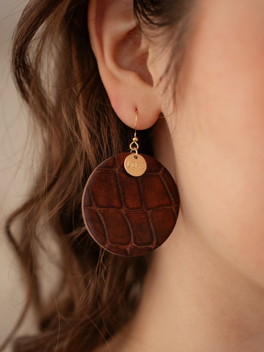 • Egyedi készítésű, csoki barna színű anyagában mintás love feliratos fülbevaló.