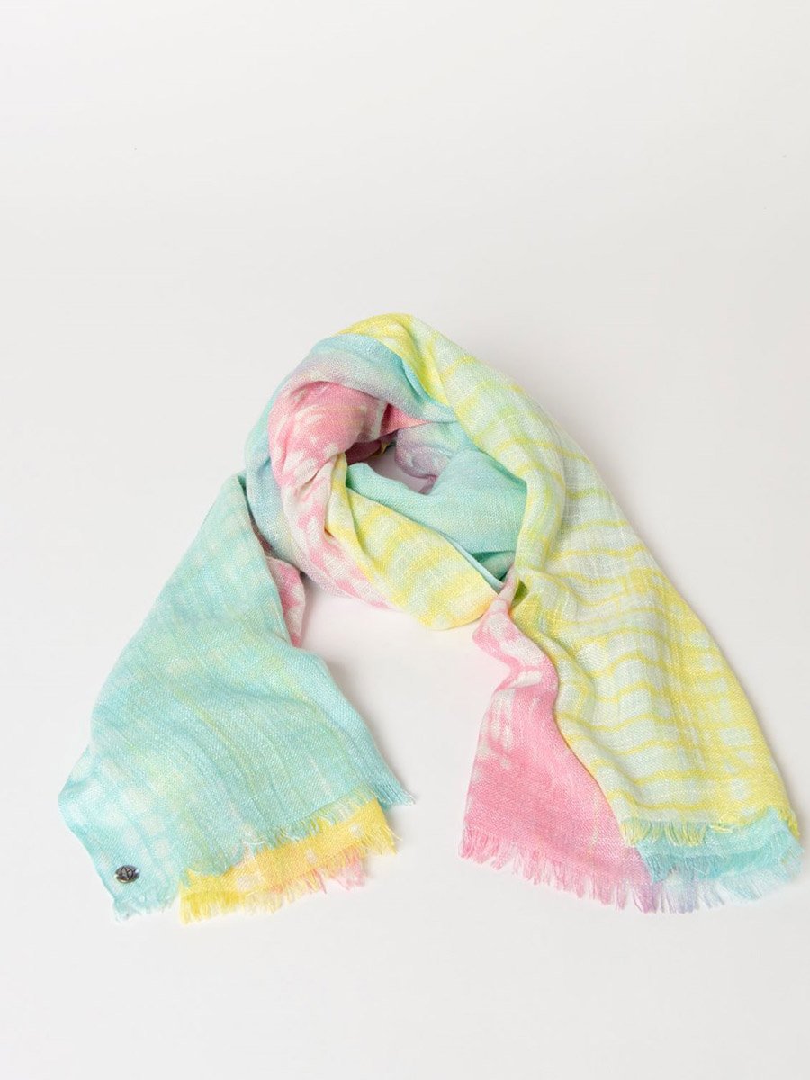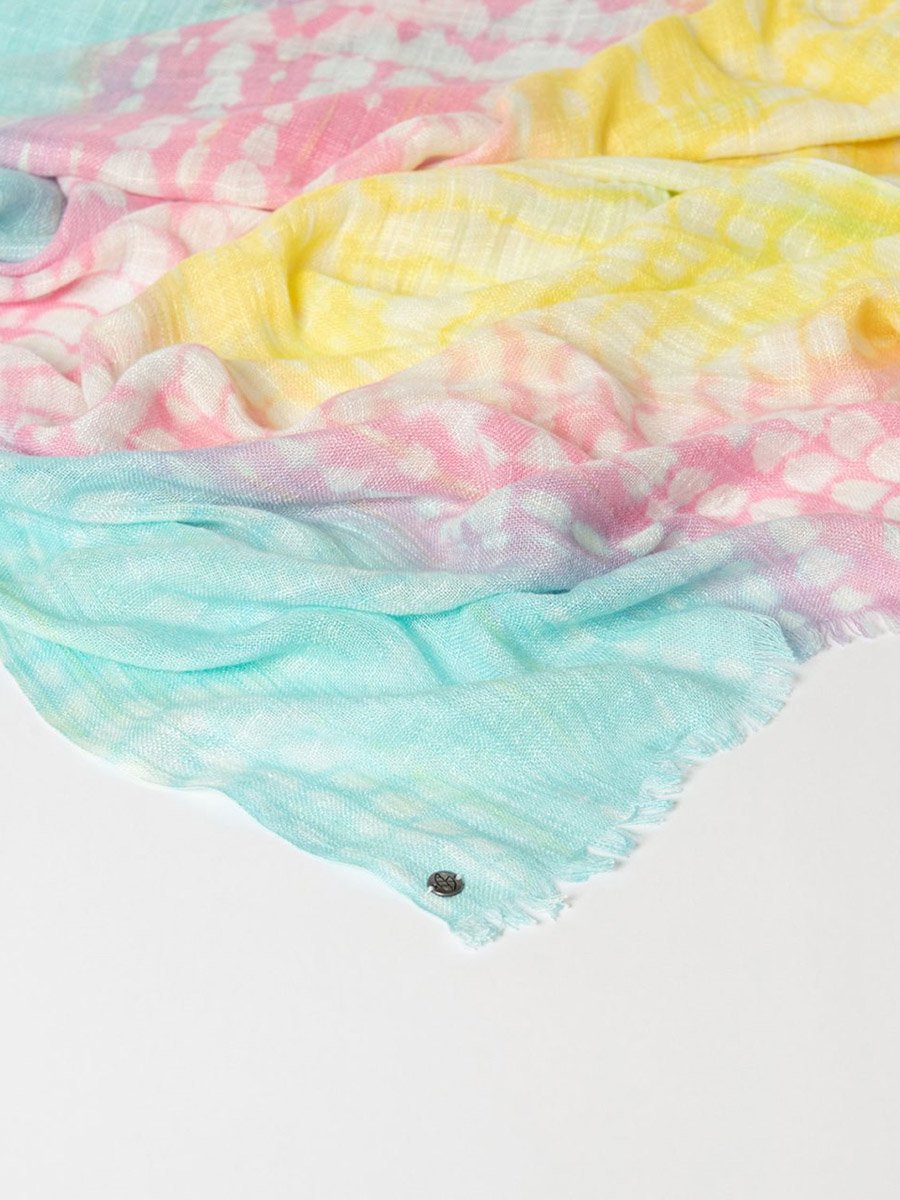 - Könnyű anyagból készült, téglalap alakú sál, átmenetes batikolt csíkos mintával.