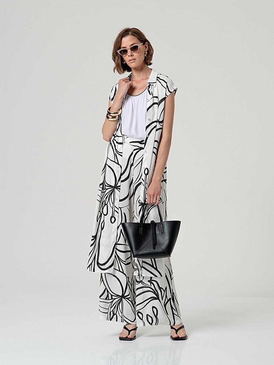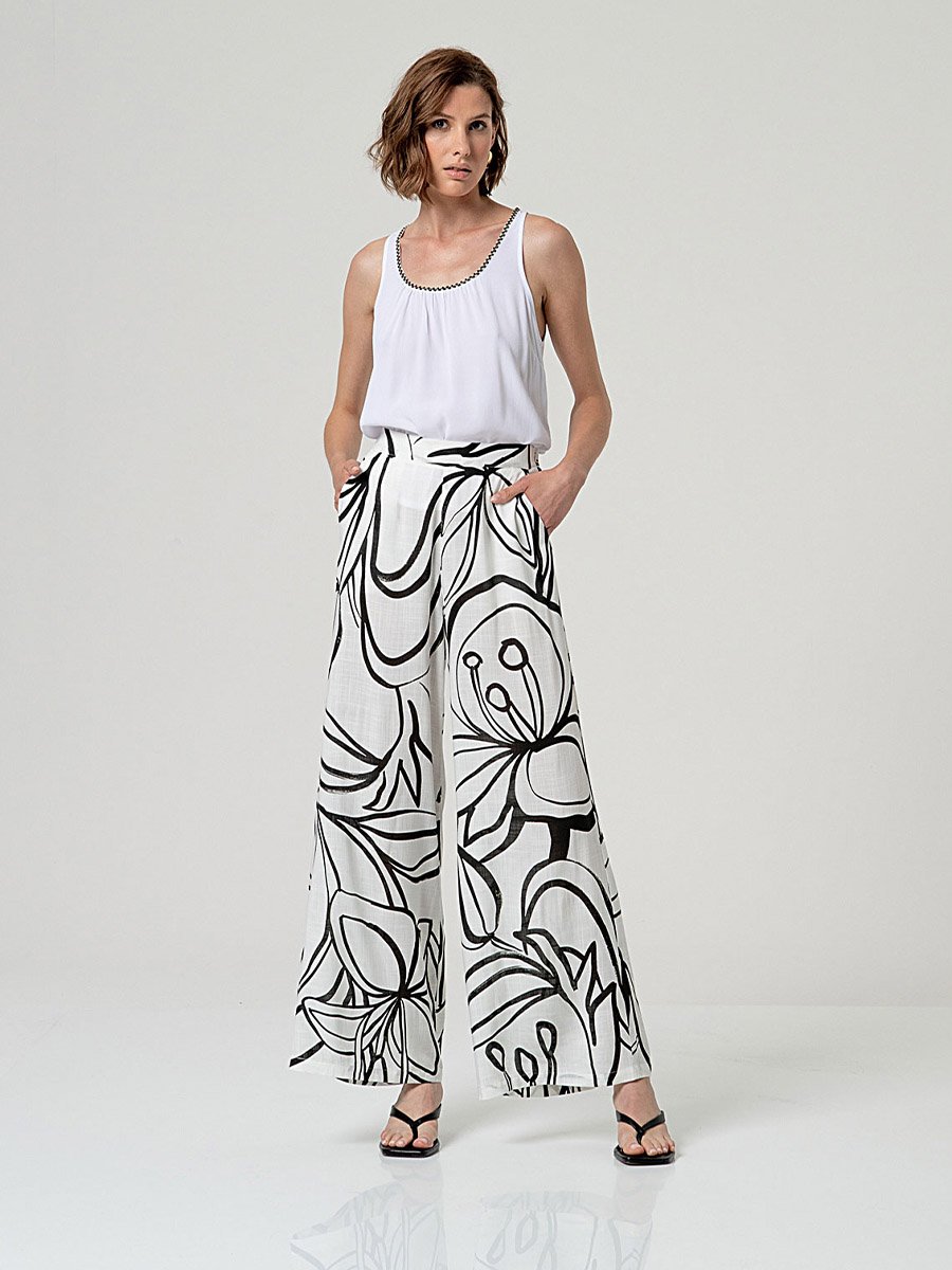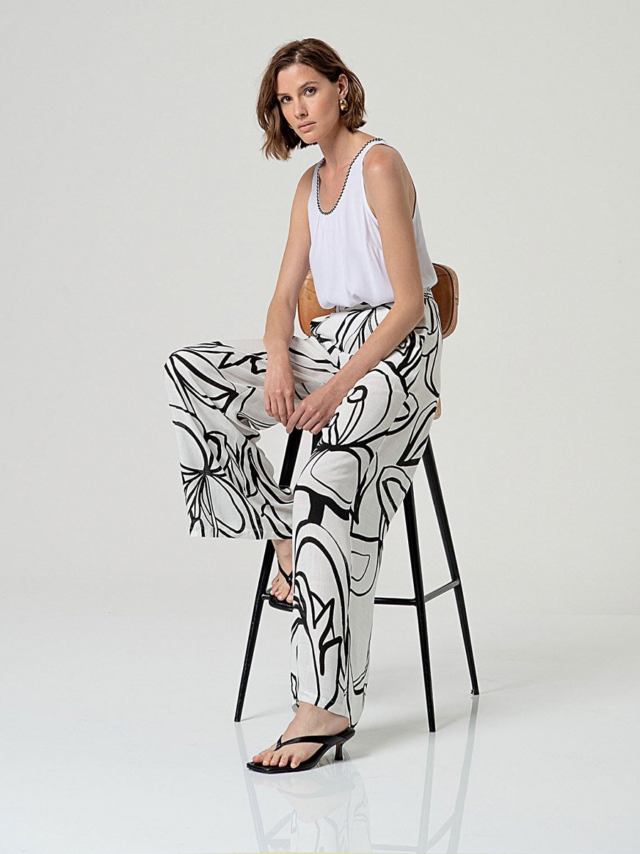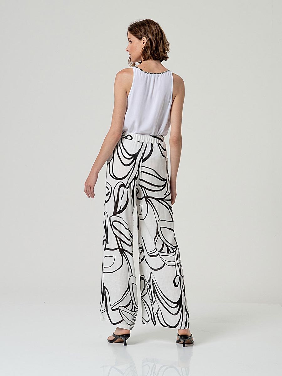 • Fehér alapon, fekete mintás, bő szárú nadrág