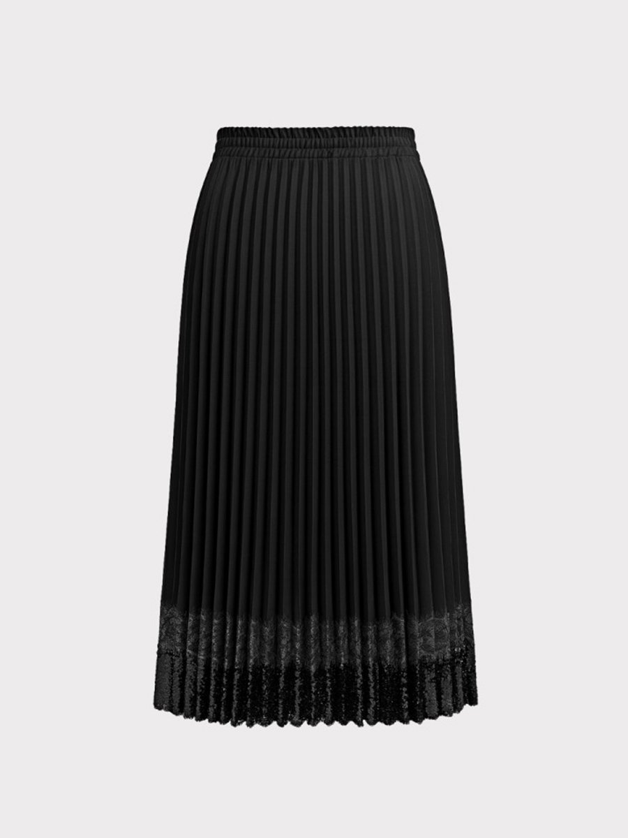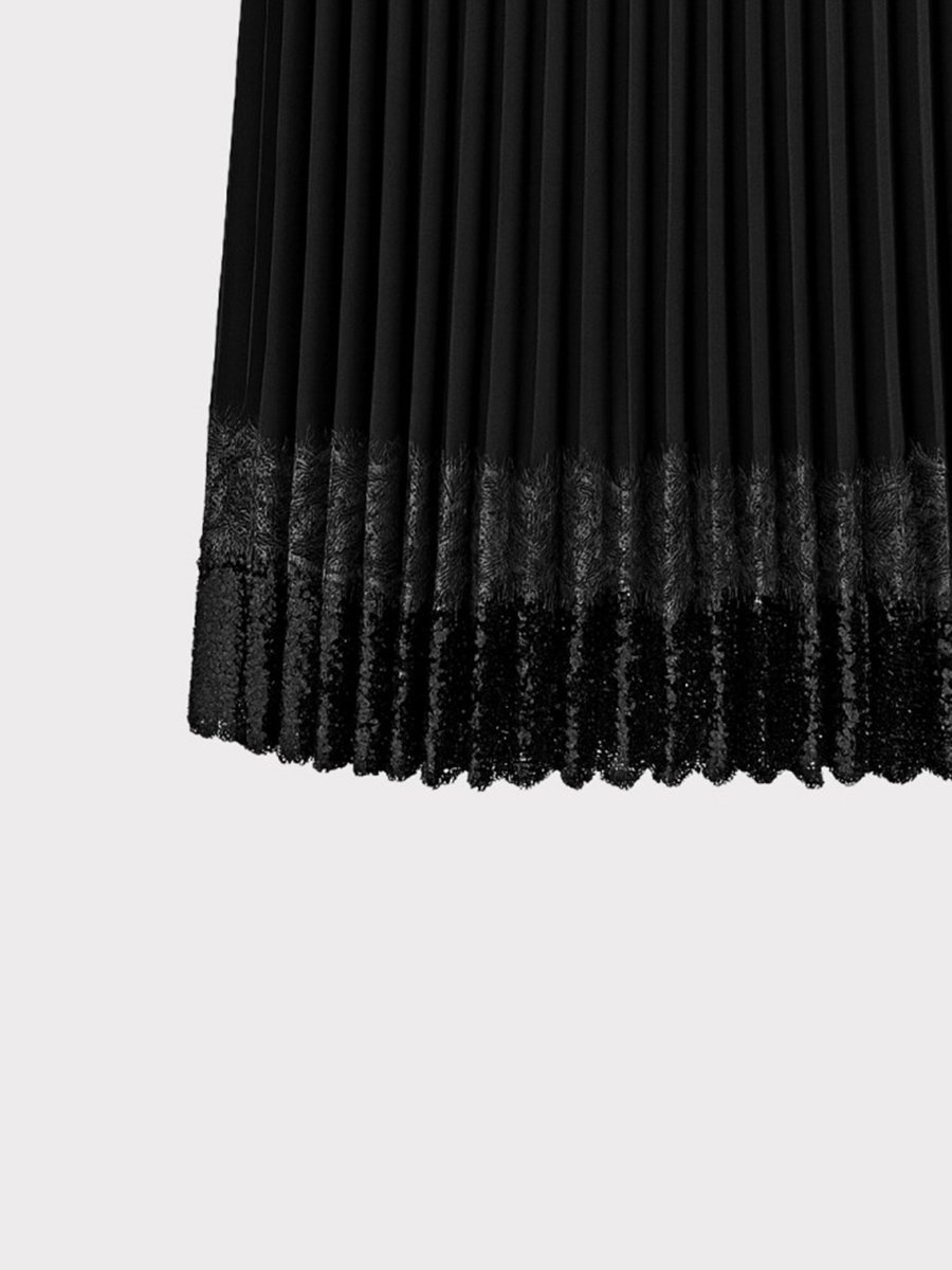 - Laza szabású, rakott midi szoknya csipkeszegéllyel és árnyalatban hozzá illő flitterekkel díszítve.