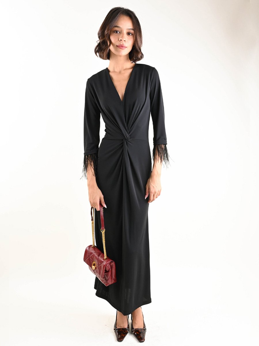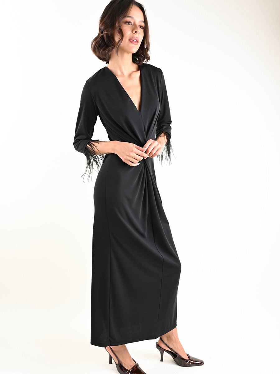 • Hosszú ruha, keresztbe vágott V-nyakkivágással és elülső csomóval, amely kiemeli a sziluettet.