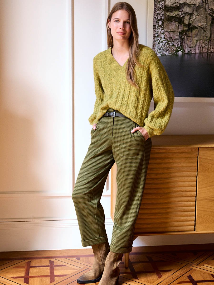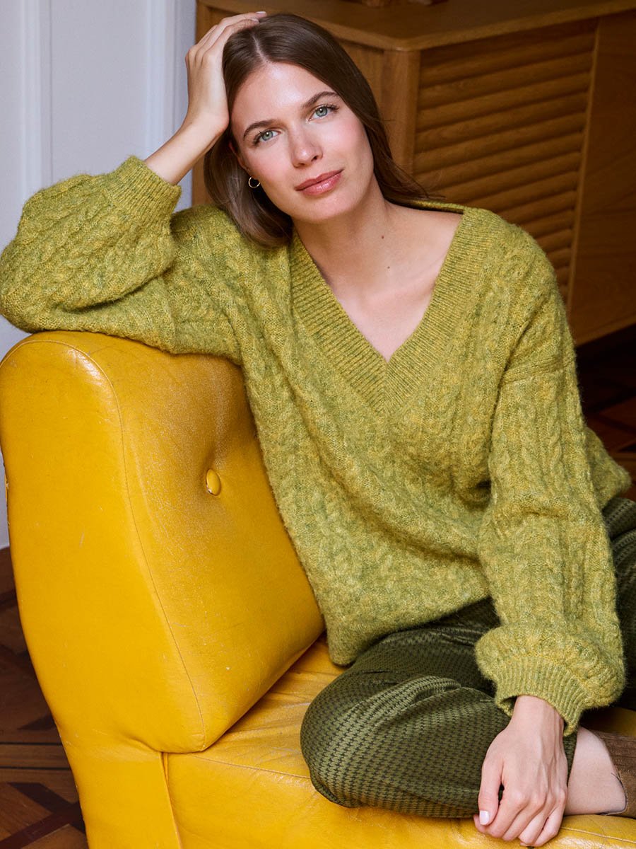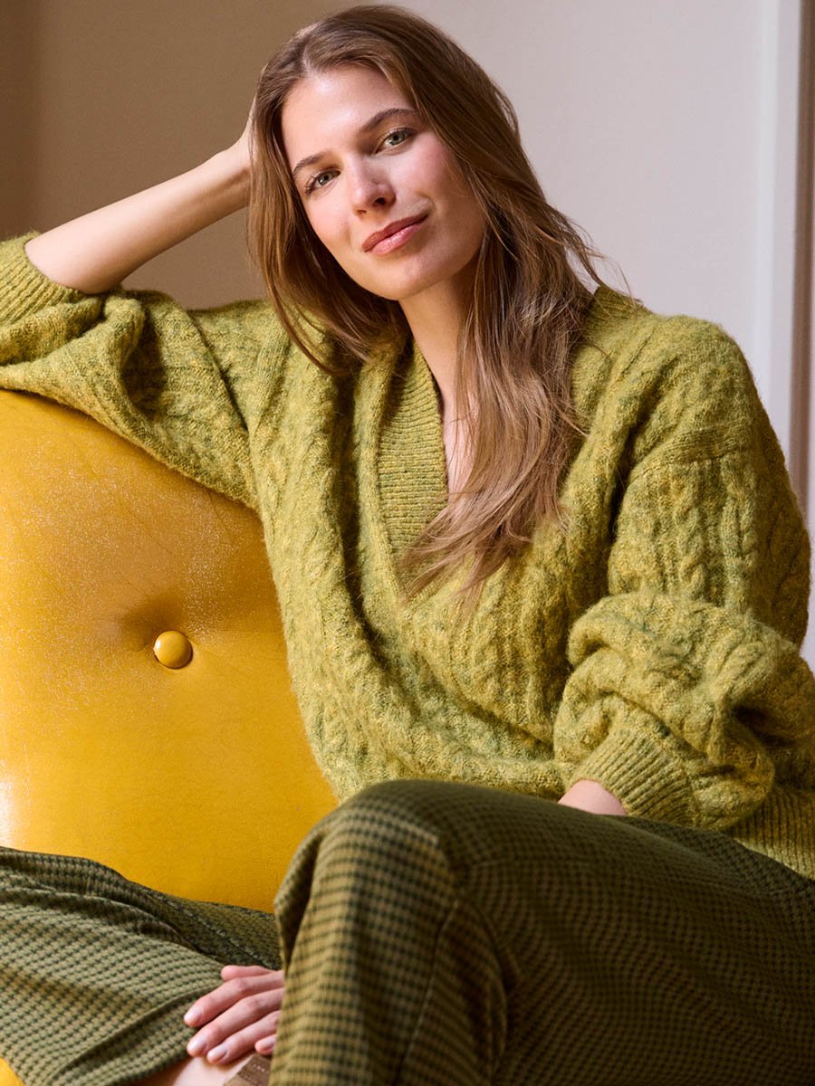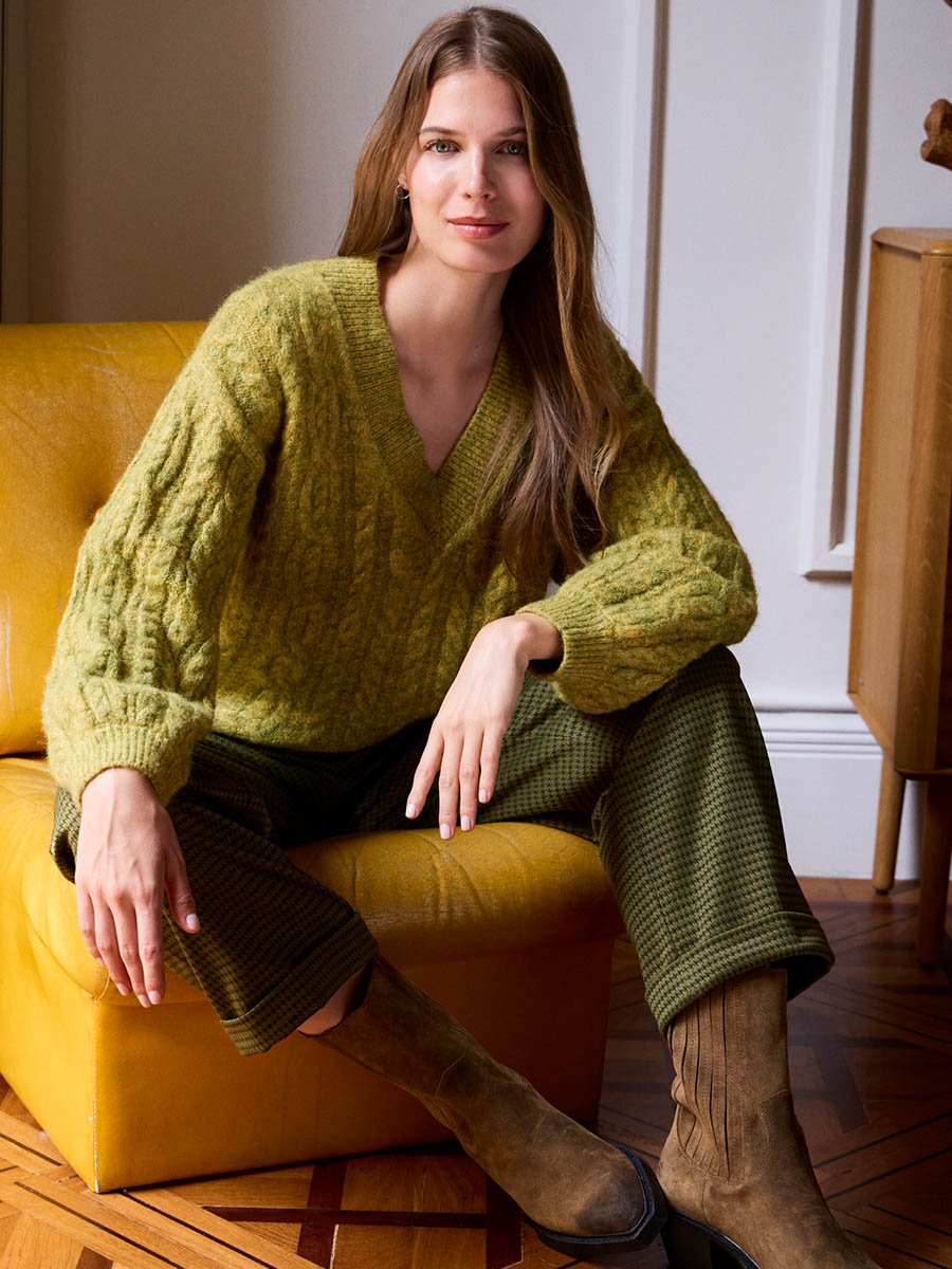 - Gyapjú, kötött pulóver, V nyakkivágással, mely kiváló választás lehet a hidegebb időre.