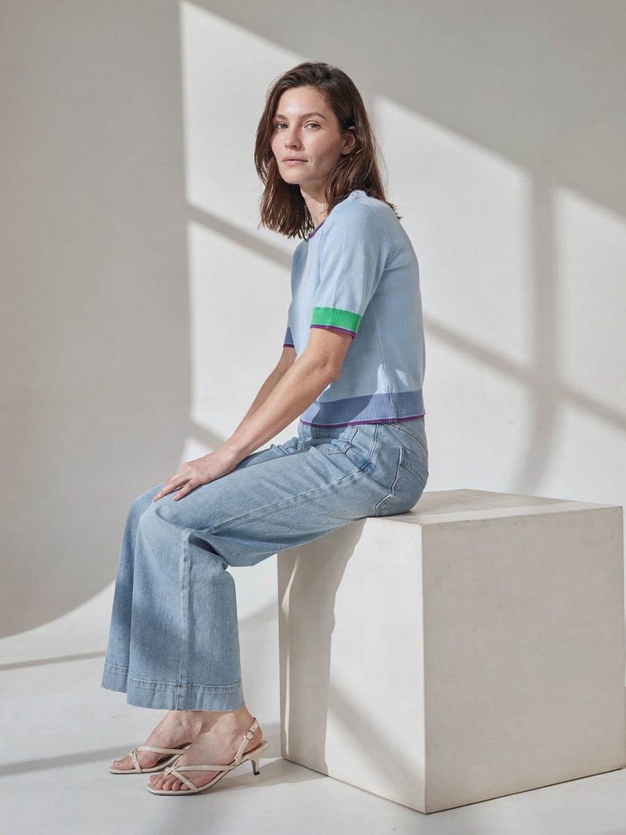 • Kerek nyakú, színes, rövid ujjú pulóver