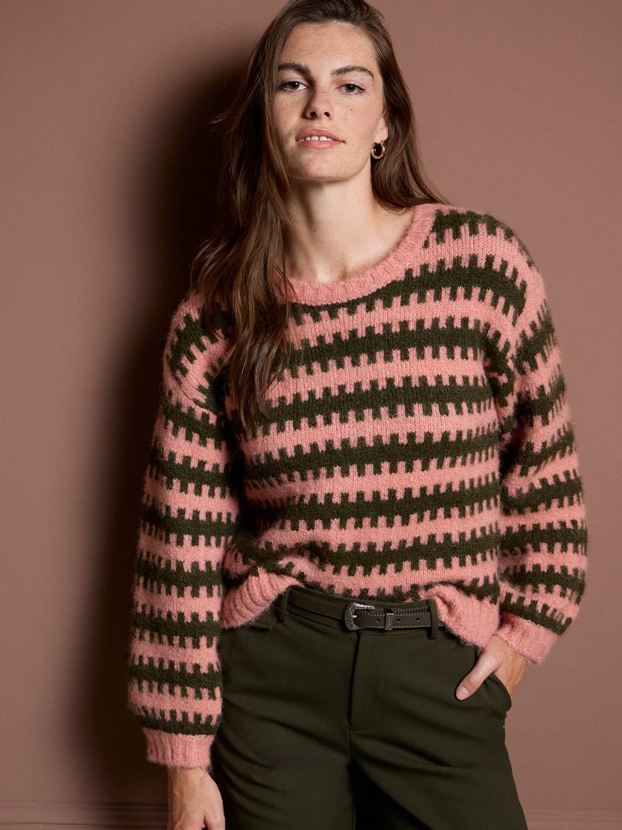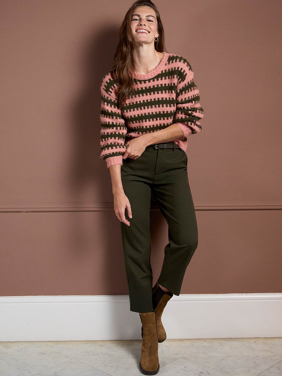 - Kerek nyakú rózsaszín zöld pulóver. M-es méret