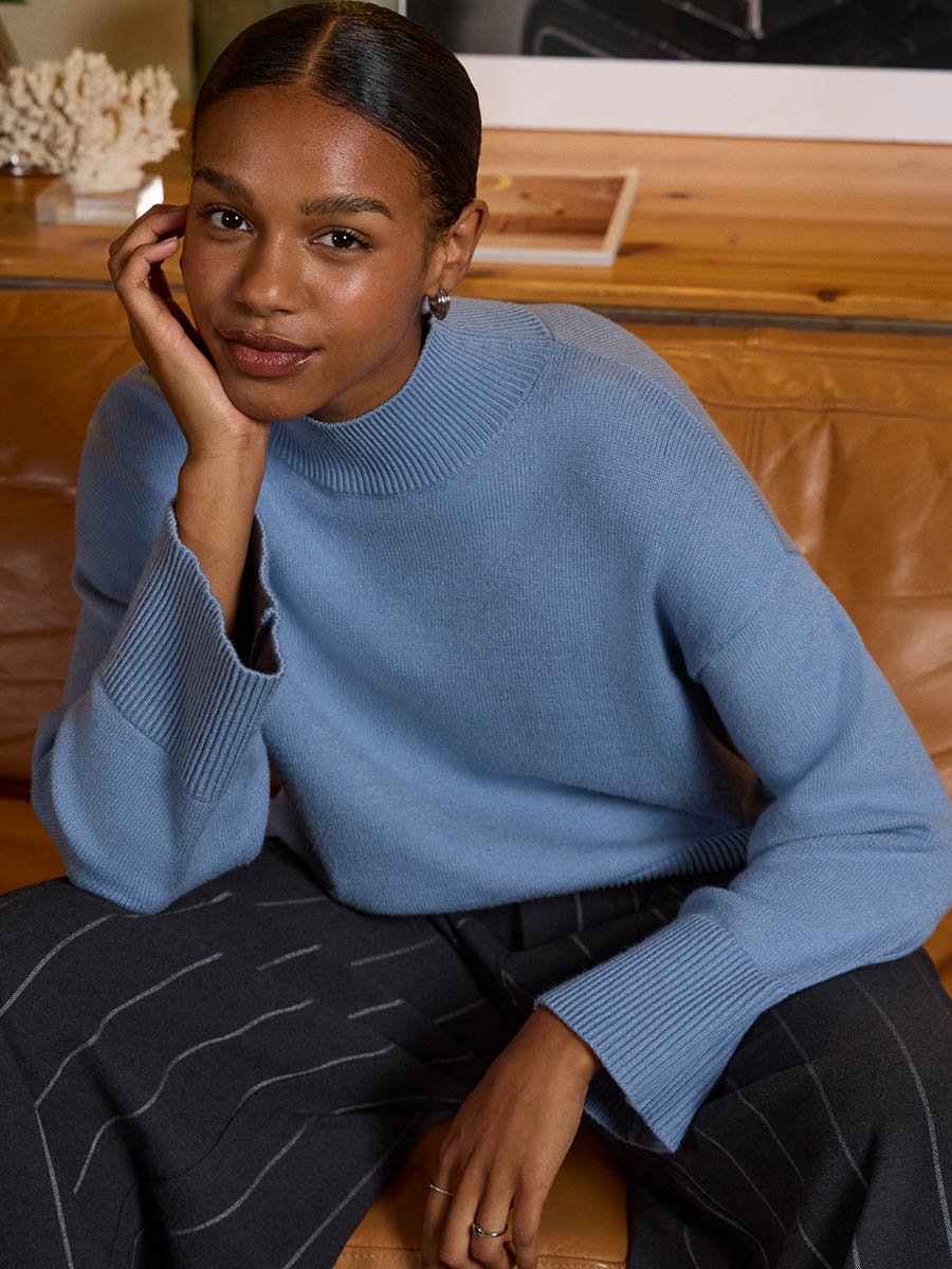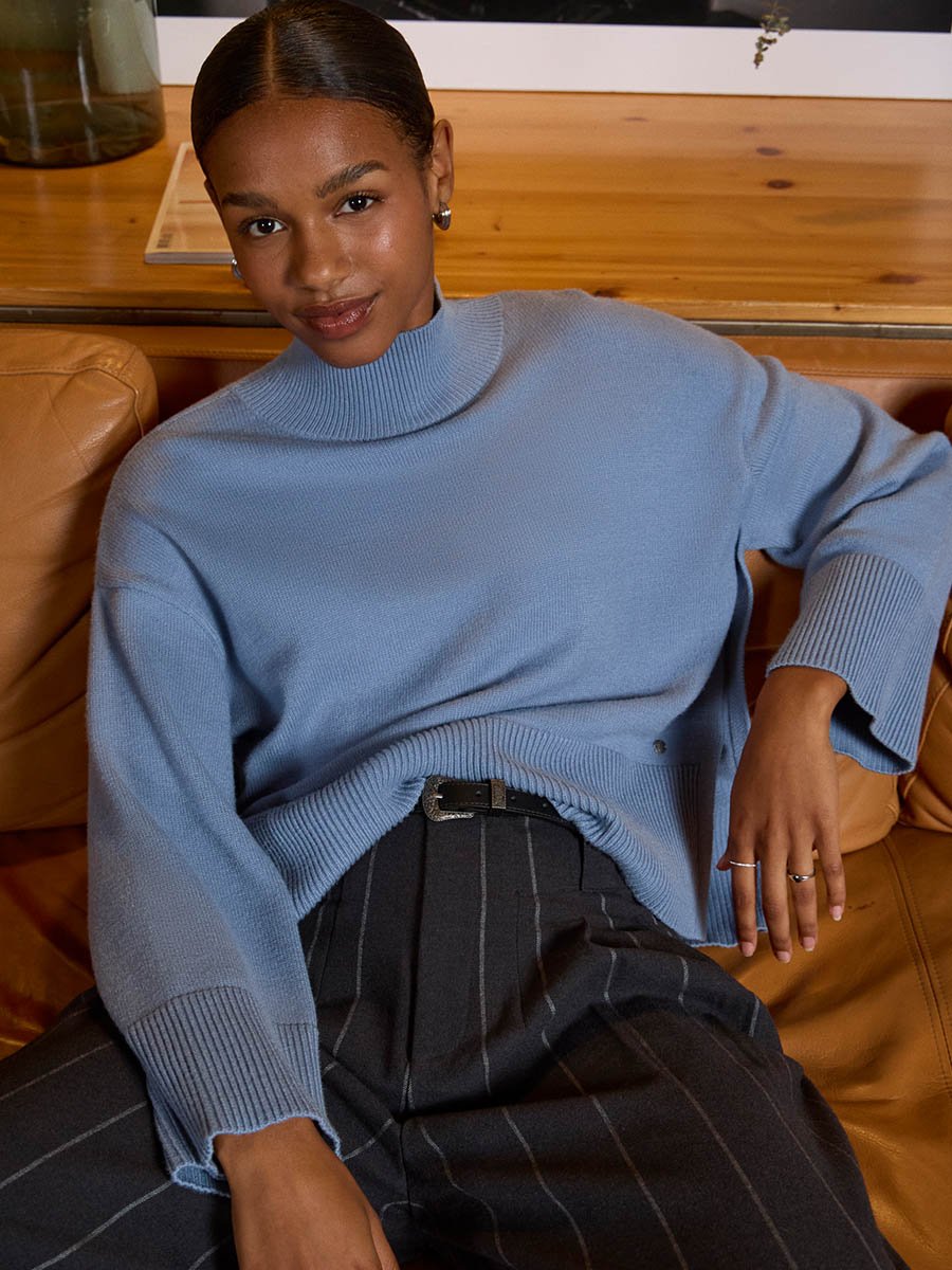 - Magas nyakú, kötött pulóver kiváló választás lehet az őszi, téli időszakra egyaránt.