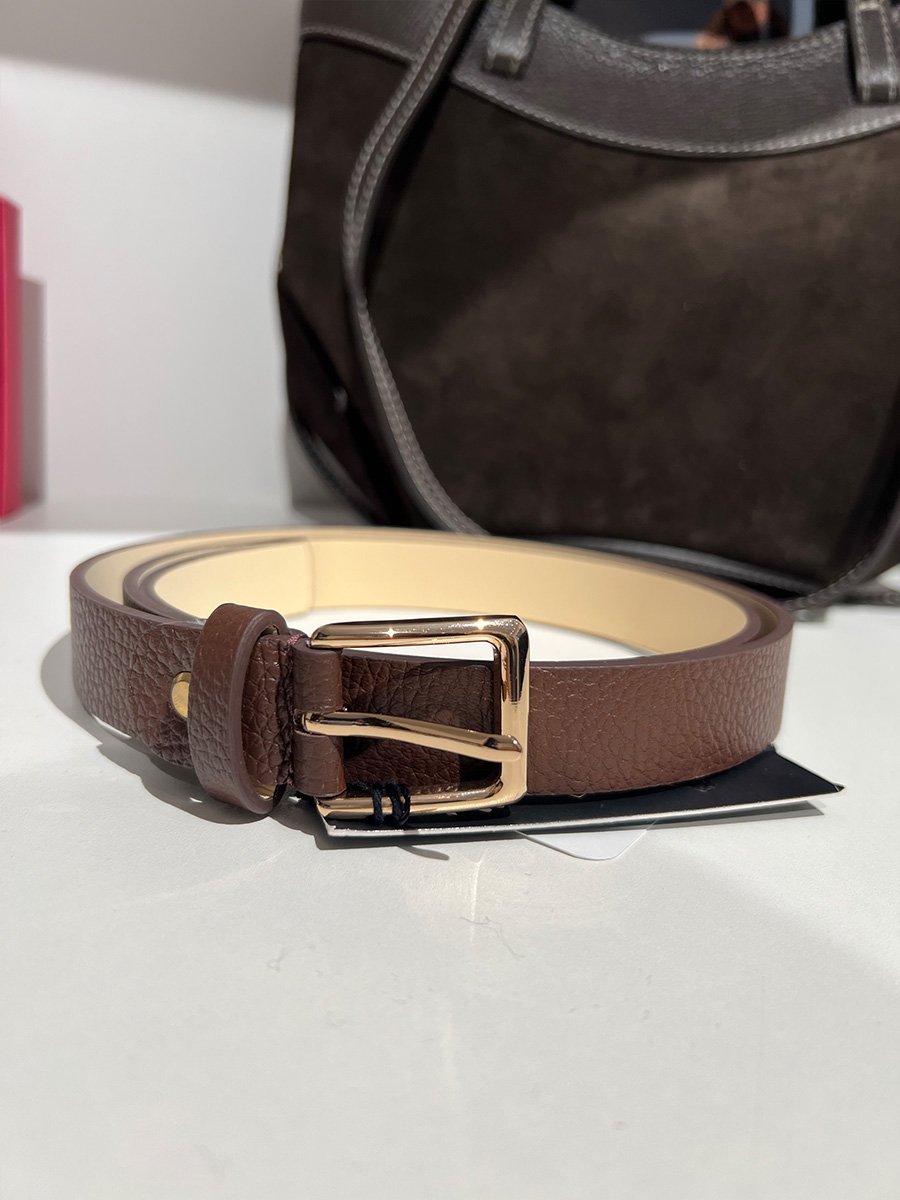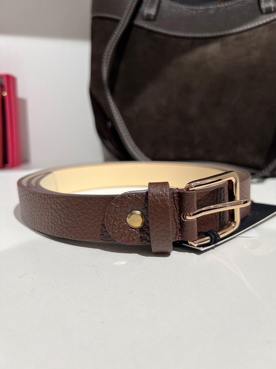 • Sötétbarna színű bőr öv arany csattal.