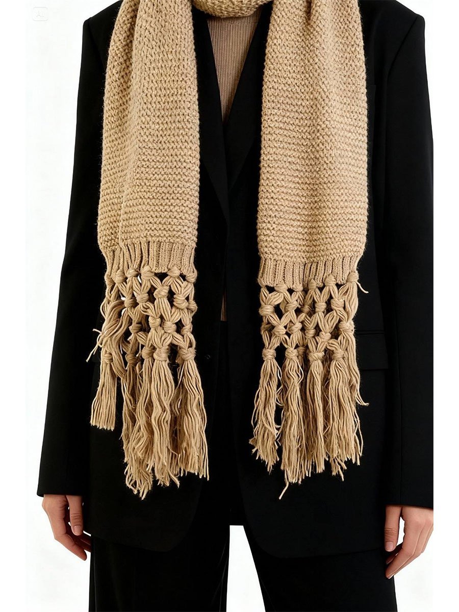 - Puha, kötött sál, amely a kényelmet és a stílust ötvözi barna dizájnjával. Remek választás a hideg napokra. Alul hosszú rojttal.