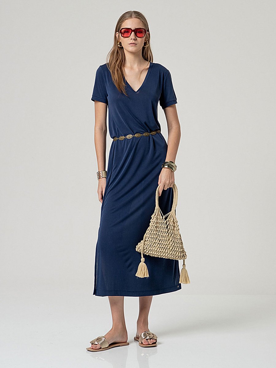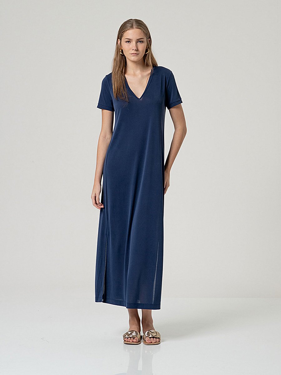 - Rövid ujjú, V-nyakú, hosszú ruha