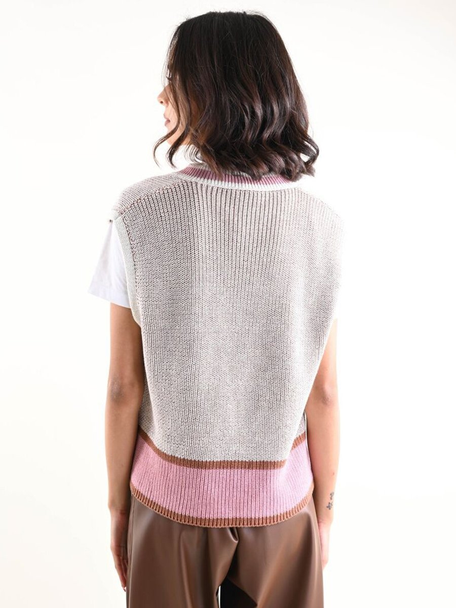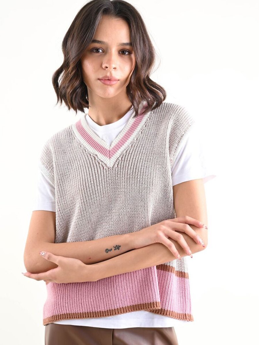 V-nyakú barna rózsaszín kötött mellény