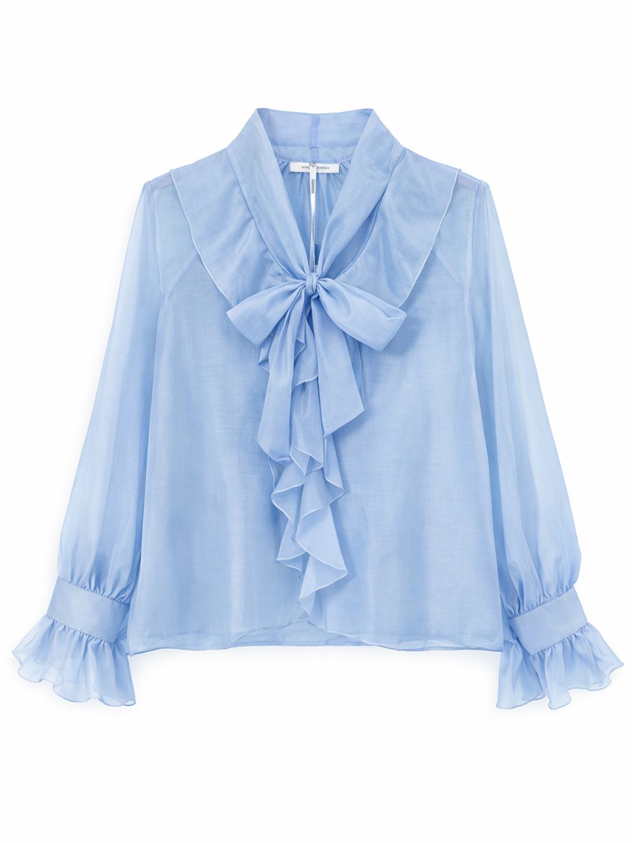 - Világoskék, masninyakú blúz, fodros ujjakkal