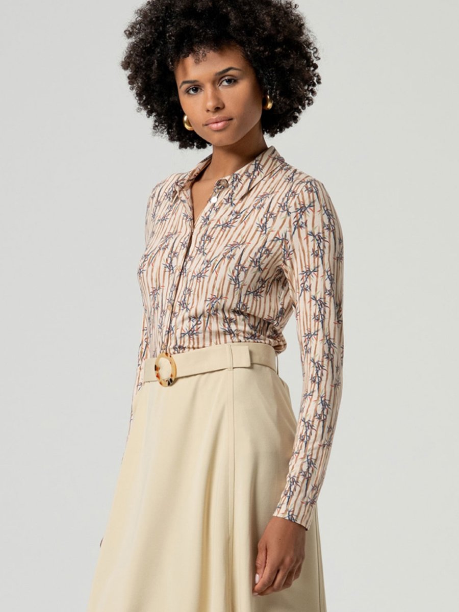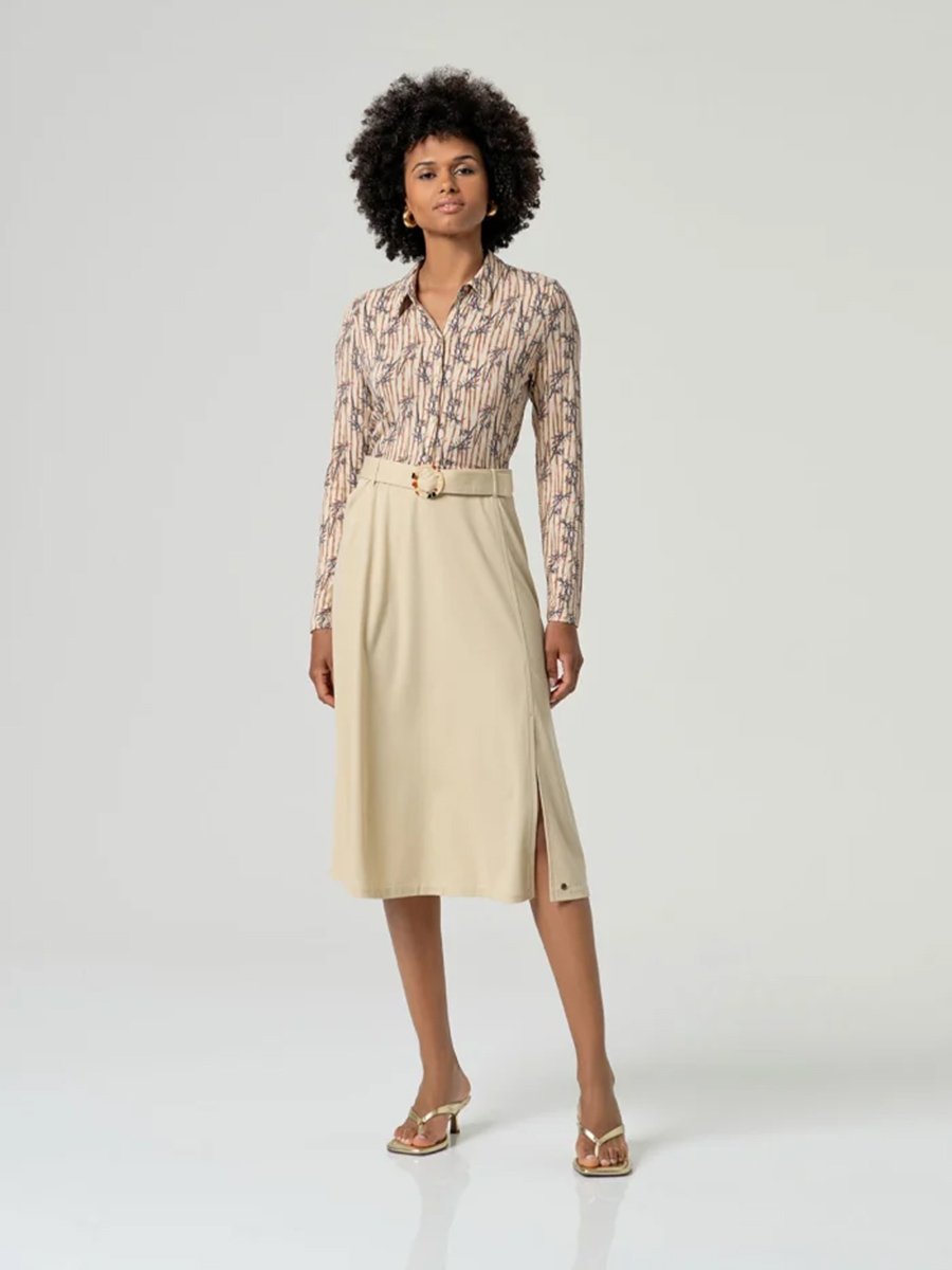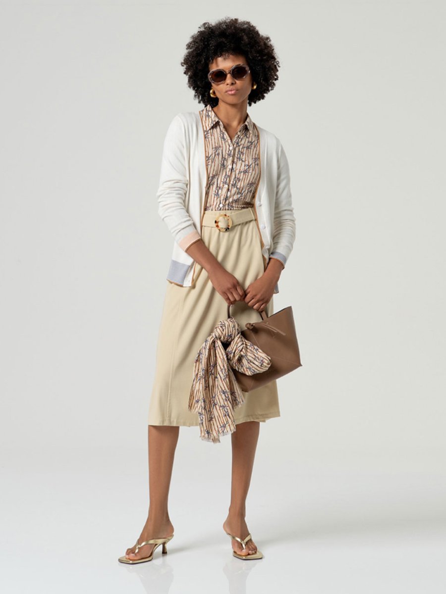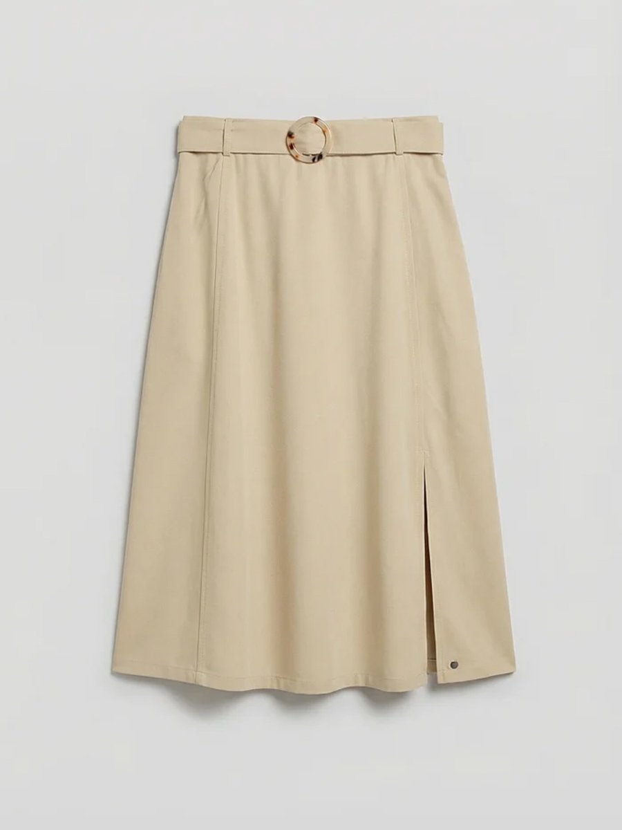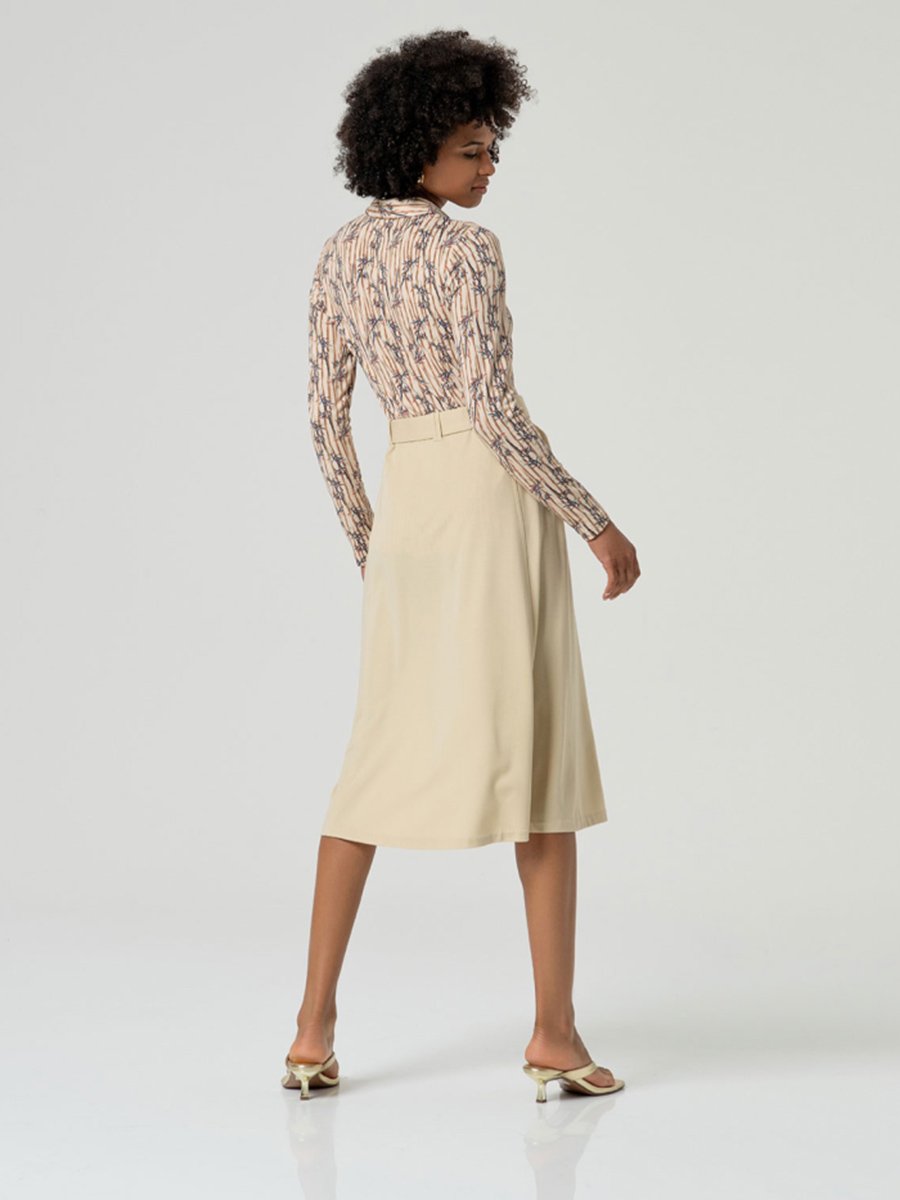• Középmagas derekú midi szoknya, rugalmas derékkal és hozzáillő övvel. Az öv bézs, fekete, piros és sárga színű