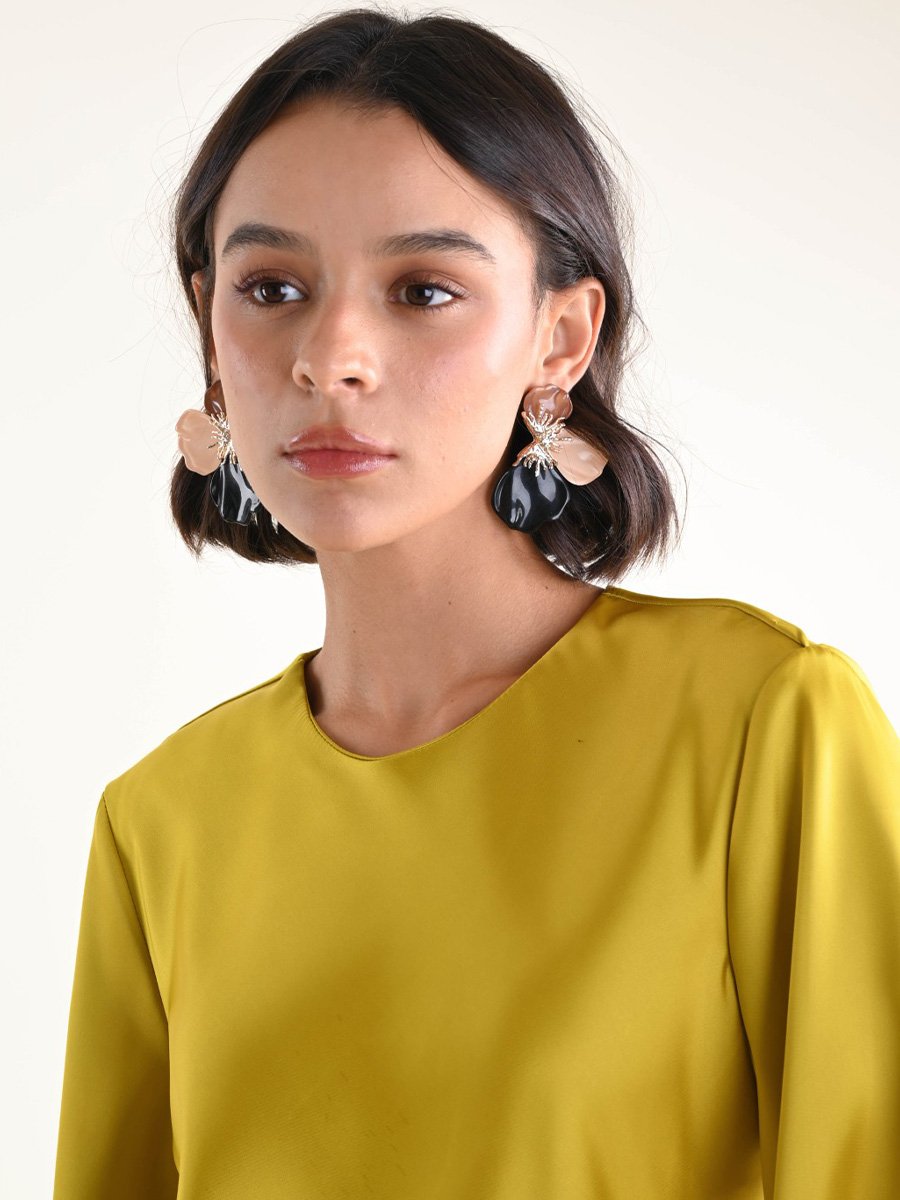 - Virág alakú, fényes szirmokkal és texturált fém középponttal ellátott bizsu fülbevaló, melyek merész és nőies hatást kölcsönöznek bármilyen öltözéknek.