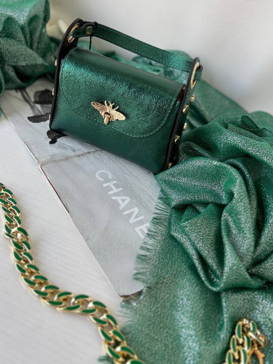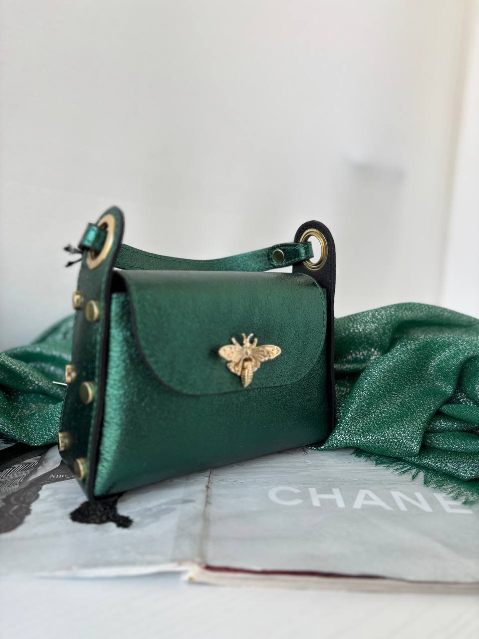 Zöld oldalt szegecses méhecskés bőr táska